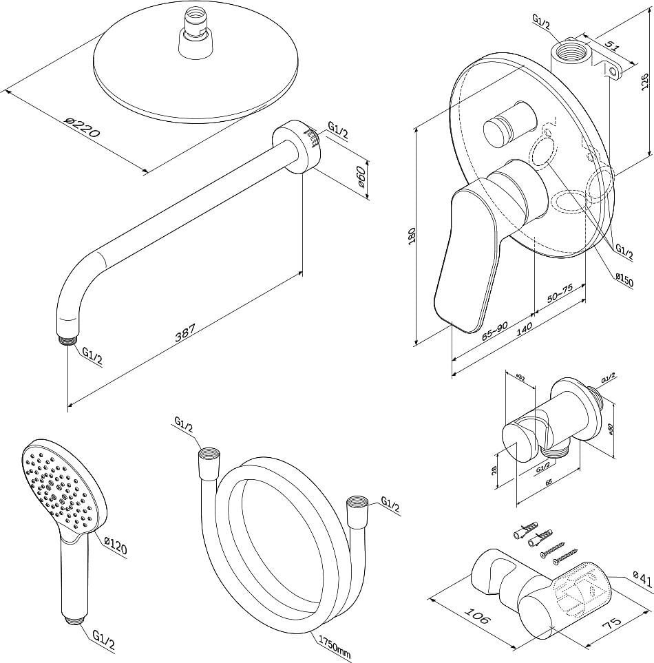 - Держатель для душа, Душевая лейка, Душевой шланг, Крепления, Кронштейн для верхнего душа, Переключатель потоков